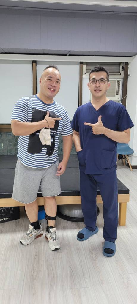 照片中是我目前在永春物理治療所復健的王孟瑋老師的合照。王老師幫忙我進行中風復健,王老師是一位非常專業的物理治療師,對中風復健這方面,非常專精,王老師扎實鍛鍊我的患側肌力和肌耐力,我才中風一年,已經敢嚐試放拐杖走路、過馬路……等等,王老師讓我突破復健瓶頸,更進一步恢復中風之前的狀態……。如果復健過程有身體不適的地方,王老師也會用專業的物理治療手法,幫我紓解身體不適的地方,總之非常推薦永春物理治療所雙和院所的王老師,給建議願意腳踏實地復健的中風病患,找王老師協助復健,絕對會突飛猛進的進步!