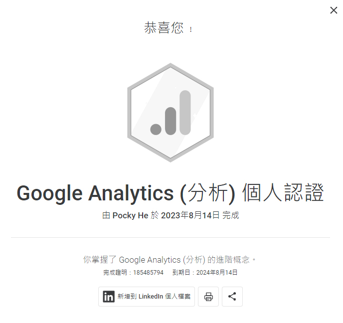 (譬如說我是電商商品企劃,我發現很多公司徵企劃人員都要求會GA分析,於是我利用空間的時間準備GA證照的相關內容,自己上Google考試,於是就考到GA證照了。)